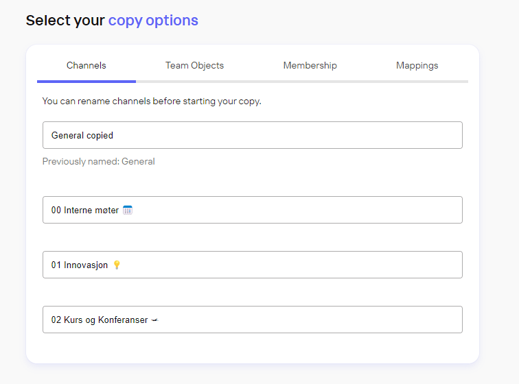 In this form, you get the opportunity to rename the channels (in the target team) in connection with the copying.