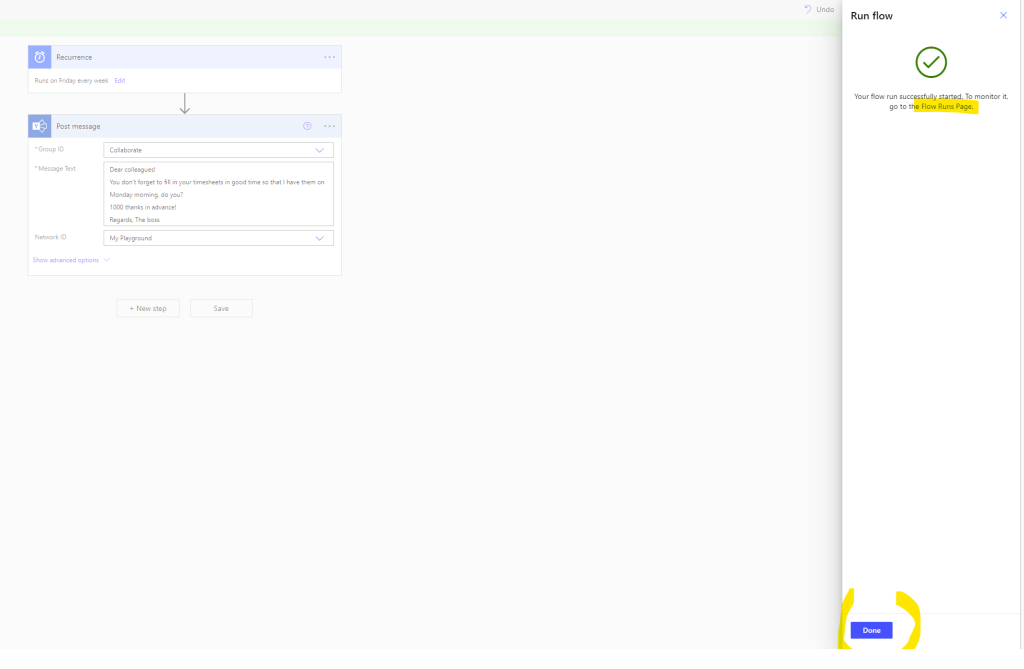 Now the flow is running and here you can either go to an overview that shows how it worked or you can click the “Done” button and then open Yammer to see if the reminder message has been posted (and posted to the correct Community).