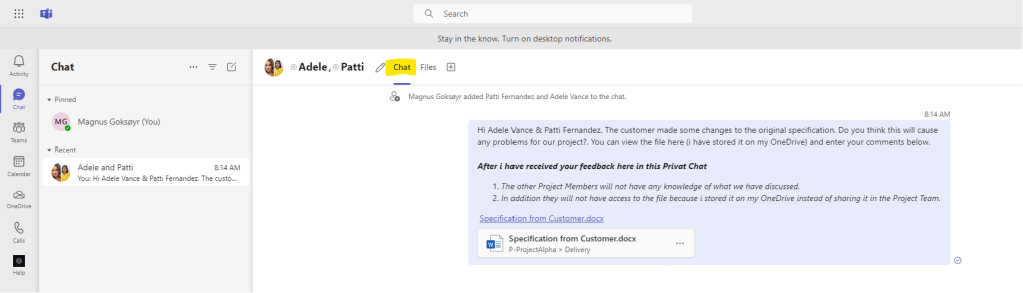 Imagine that you are involved in a project. You want to inform and receive feedback on a change communicated by the customer. You start a Private Chat in Microsoft Teams with just a few of your project collaborators. A dialogue will then follow in the chat. At worst, you’ve shared a file here that’s on your OneDrive. When you have finished the chat dialogue, the other project participants, who were not part of the chat, have no idea what you discussed and have probably missed information that was more or less important to them as well. In addition, you have stored a project-relevant file on OneDrive instead of in the project’s Team, which means that it is only available to those you shared it with.