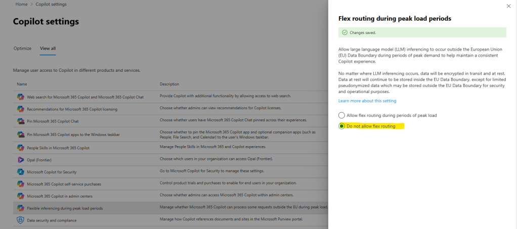 If you do NOT want to allow large language model (LLM) inferencing to occur outside the European Union (EU) Data Boundary during periods of peak demand to help maintain a consistent Copilot experience, You should set this setting to “Do not allow flex routing”.